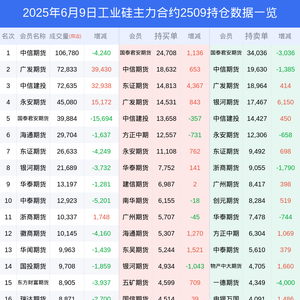 新浪期货 根据交易所数据,截至6月09日收盘主力合约工业硅2509,涨跌+2.53%,成交量34.95万手,持仓数据显示前20席位呈现净空,差额头寸为22034手。
