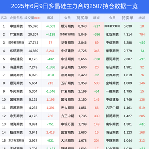 新浪期货 根据交易所数据,截至6月09日收盘主力合约多晶硅2507,涨跌-2.24%,成交量12.37万手,持仓数据显示前20席位呈现净多,差额头寸为8798手。