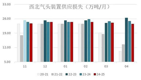 2024年11月至2025年4月期间,西南地区气头装置产量损失总量低于历史同期,相对前一年度数据来看,11月至1月单月损失偏低,2至4月单月相对偏高,但幅度不大,整体损失较2023年11月至2024年4月期间减少10万吨左右。