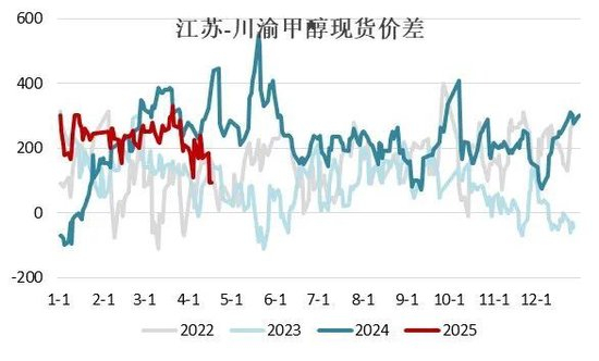 产量损失的同比变化也表现在地区价差的波动上。2024年底至2025年初较低的损失量使西南甲醇市场供应不如往年紧缺,价格显著弱于港口,期间西南地区价格对江苏的贴水幅度处于历史同期偏高水平。这一情况一直维持到2024年3月底,因此4月期间内地主要地区需求较好,供需改善,港口地区价格相对多个地区的价格都有走弱,江苏-川渝价差也有下滑。