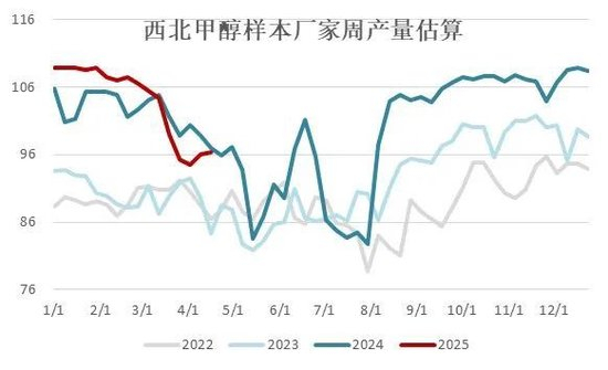 近年来西北地区煤制或焦炉气制甲醇装置不断投产,天然气制甲醇在西北市场占比已经非常低,因此,冬季气头产量损失变化对西北地区产量的影响力逐年减小。2024-2025年冬季期间,煤制甲醇大幅盈利,大量装置处于高开工状态,因此,与西南地区情况不同,冬季期间西北地区甲醇产量维持高位,并未受到气头装置开停变化影响。