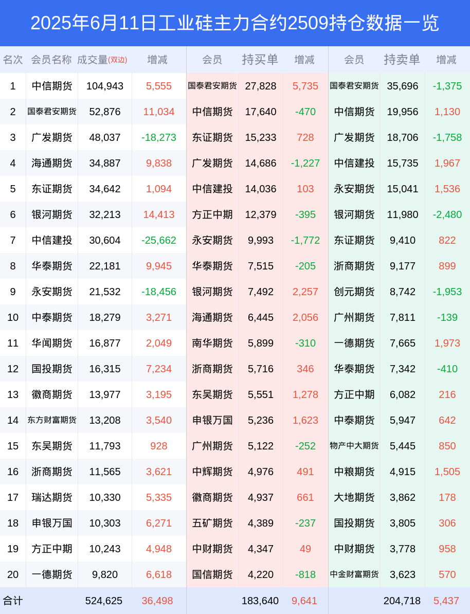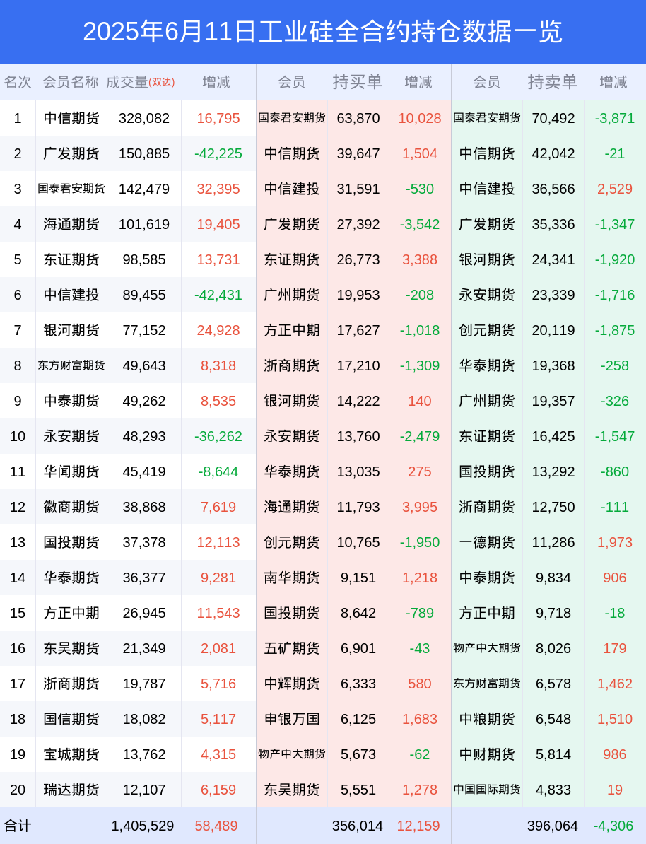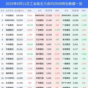 新浪期货 根据交易所数据,截至6月11日收盘主力合约工业硅2509,涨跌+1.55%,成交量36.13万手,持仓数据显示前20席位呈现净空,差额头寸为21078手。