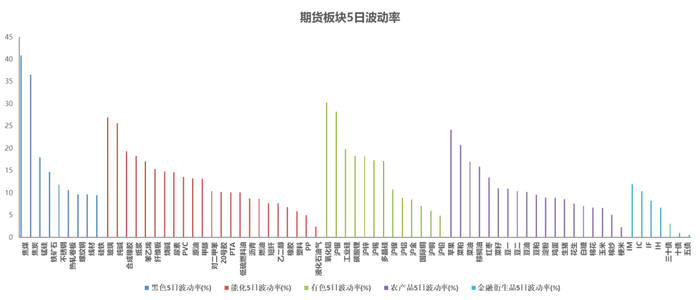 从5日波动率水平看,前三位为集运欧线、焦煤和焦炭;低波动前三品种为二债、五债和十债。