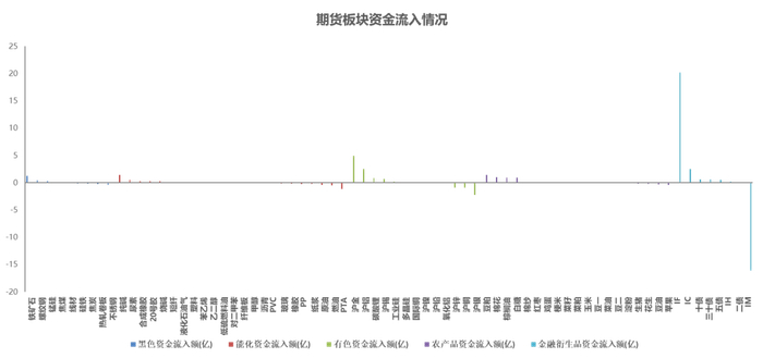 从板块资金流动情况来看,股指、有色多数流入,能化多数流出。