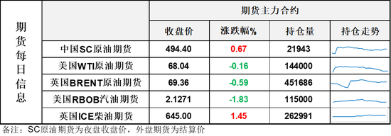 【1】WTI主力原油期货收跌0.11美元,跌幅0.16%,报68.04美元/桶;布伦特主力原油期货收跌0.41美元,跌幅0.59%,报69.36美元/桶;INE原油期货收涨0.67%,报494.4元。