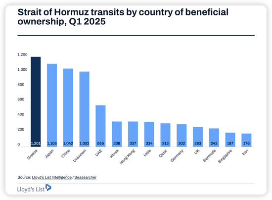 一旦这种情况发生,每月超过5亿桶从产油国东向输出的原油将不得不寻找其他途径进入市场。按2025年第一季度的船只拥有国来分解,希腊、日本和中国的船只占主导地位,因而将最受关闭影响。