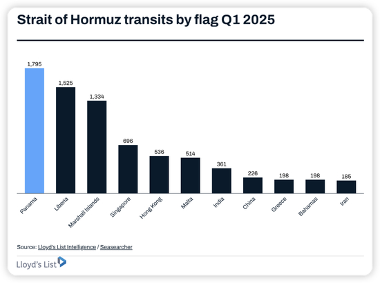 巴拿马旗船只使用霍尔木兹海峡最多,其次是利比里亚旗和马绍尔群岛旗船只。如果局势升级,美国和以色列关联船只可能成为袭击目标。但如我们在红海危机期间所见,识别这些关联并非易事,这也可能使其他船只面临风险。
