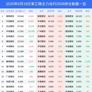 新浪期货 根据交易所数据,截至6月19日收盘主力合约苯乙烯2508,涨跌+2.00%,成交量22.15万手,持仓数据显示前20席位呈现净空,差额头寸为6491手。