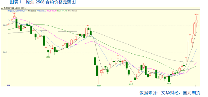 今日国内大宗商品市场开盘呈现出涨多跌少的局面,其中能源化工品中的原油涨幅居前,带动油系化工品重心上移。而自6月12日起至今,国内原油2508合约盘面价格已走出了6连阳,整体走势相对偏强,我们认为主要是受以下交易逻辑的推动。