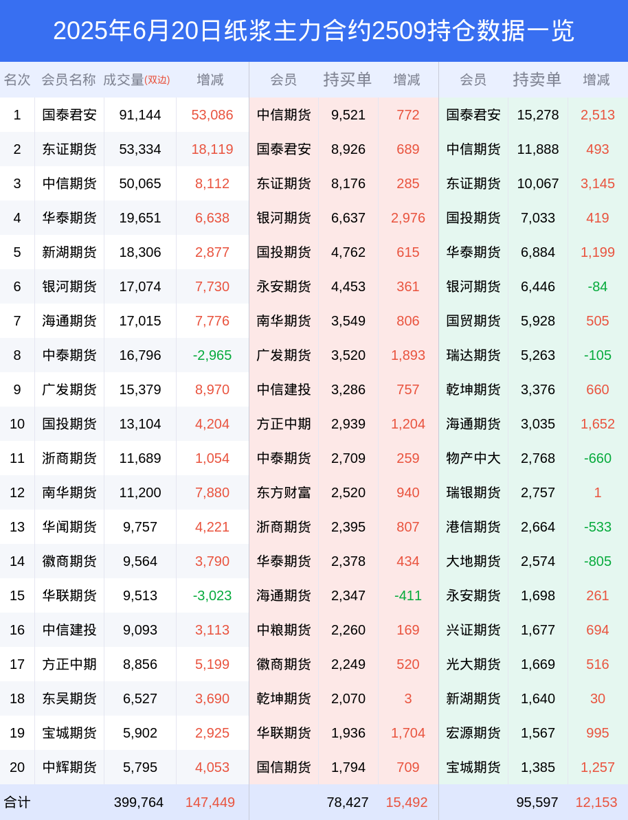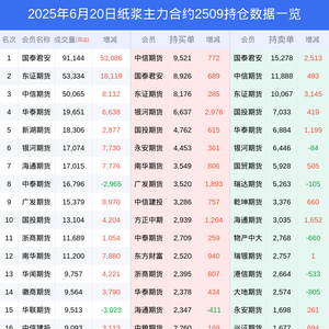 新浪期货 根据交易所数据,截至6月20日收盘主力合约纸浆2509,涨跌-2.55%,成交量28.48万手,持仓数据显示前20席位呈现净空,差额头寸为17170手。