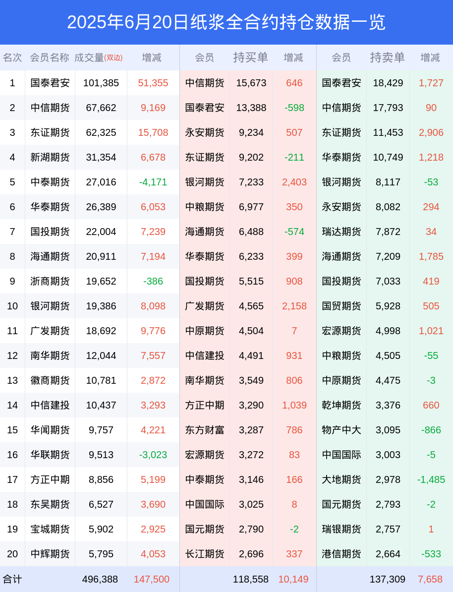 纸浆期货全合约总计成交36.92万手,比上一日新增11.68万手。全合约前20席位多头持仓13.54万手,比上一日增加1.40万手。全合约前20席位空头持仓15.47万手,比上一日增加9861手。