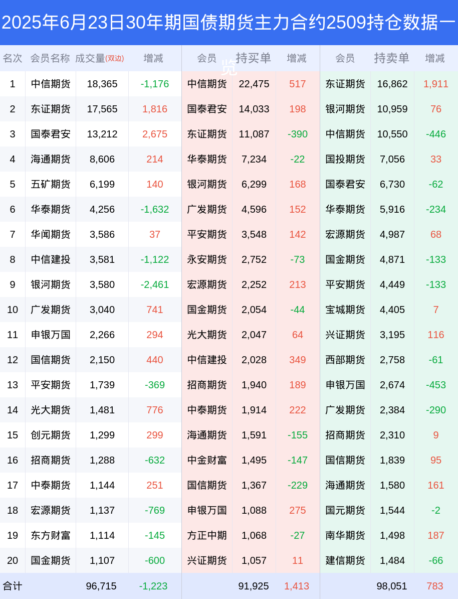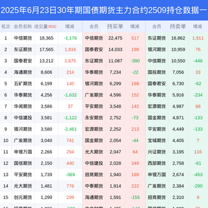新浪期货 根据交易所数据,截至6月23日收盘主力合约30年期国债期货2509,涨跌-0.04%,成交量6.12万手,持仓数据显示前20席位呈现净空,差额头寸为6126手。