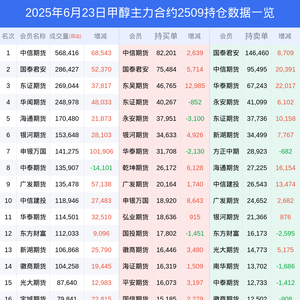 新浪期货 根据交易所数据,截至6月23日收盘主力合约甲醇2509,涨跌-1.34%,成交量249.69万手,持仓数据显示前20席位呈现净空,差额头寸为96267手。