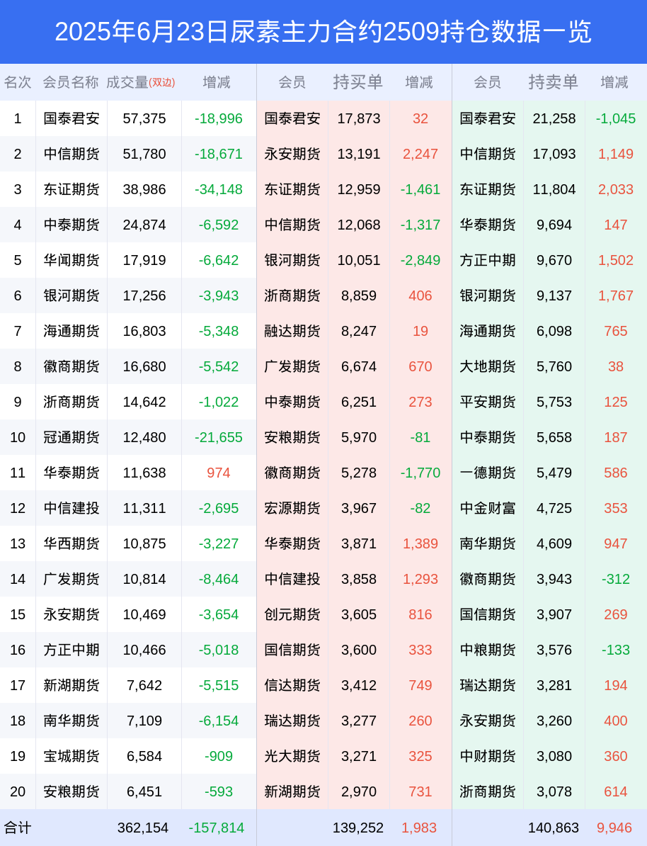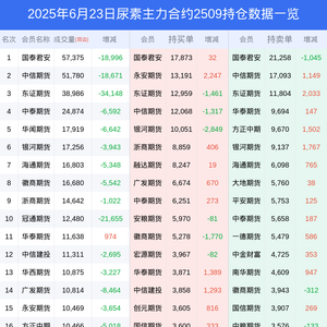 新浪期货 根据交易所数据,截至6月23日收盘主力合约尿素2509,涨跌-2.00%,成交量26.97万手,持仓数据显示前20席位呈现净空,差额头寸为1611手。