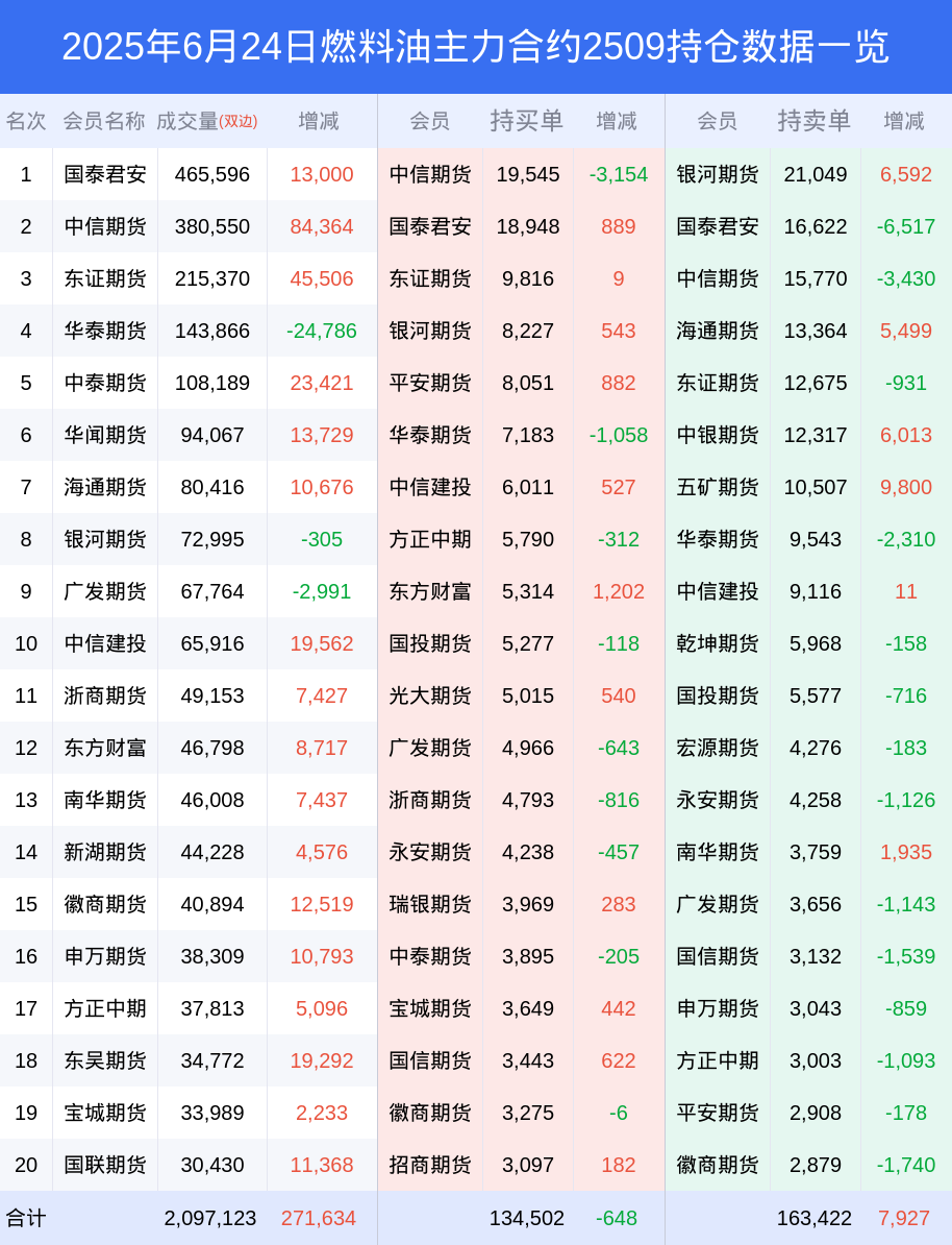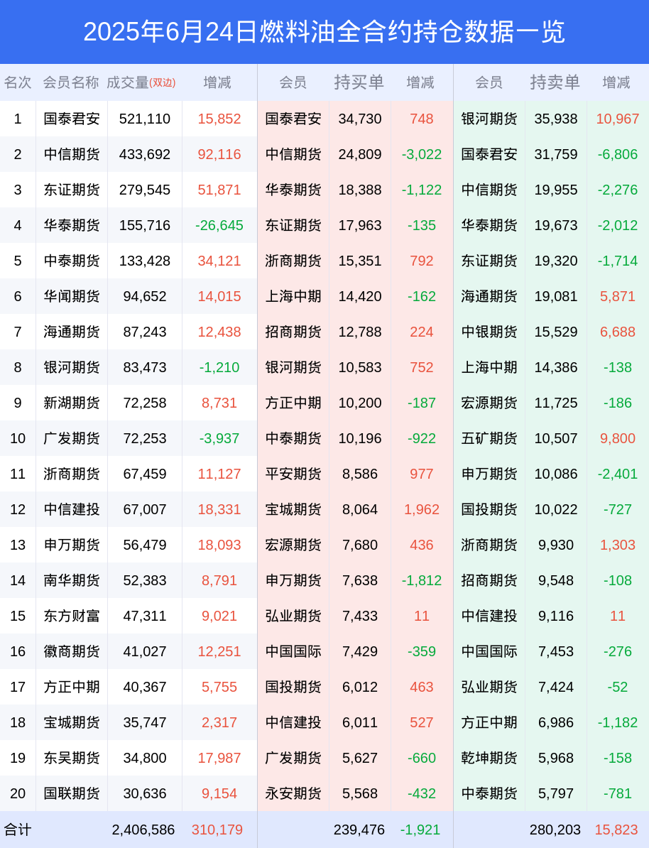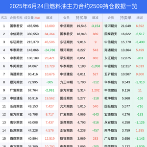 新浪期货 根据交易所数据,截至6月24日收盘主力合约燃料油2509,涨跌-9.02%,成交量144.16万手,持仓数据显示前20席位呈现净空,差额头寸为28920手。