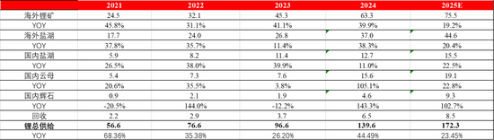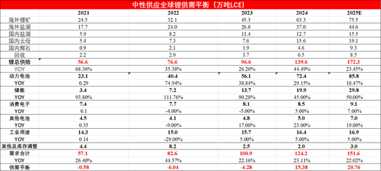 供需平衡:综上我们认为,在中性供应和乐观需求的预期下,2025年全球锂资源仍将过剩20.76万吨。