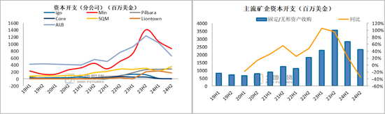资本开支:截止24H2,主流矿山资本开支23.23亿美金,同比-35%