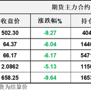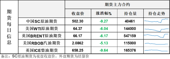 【1】WTI主力原油期货收跌4.14美元,跌幅6.04%,报64.37美元/桶;布伦特主力原油期货收跌4.35美元,跌幅6.17%,报66.17美元/桶;INE原油期货收跌9.27%,报502.3元。
