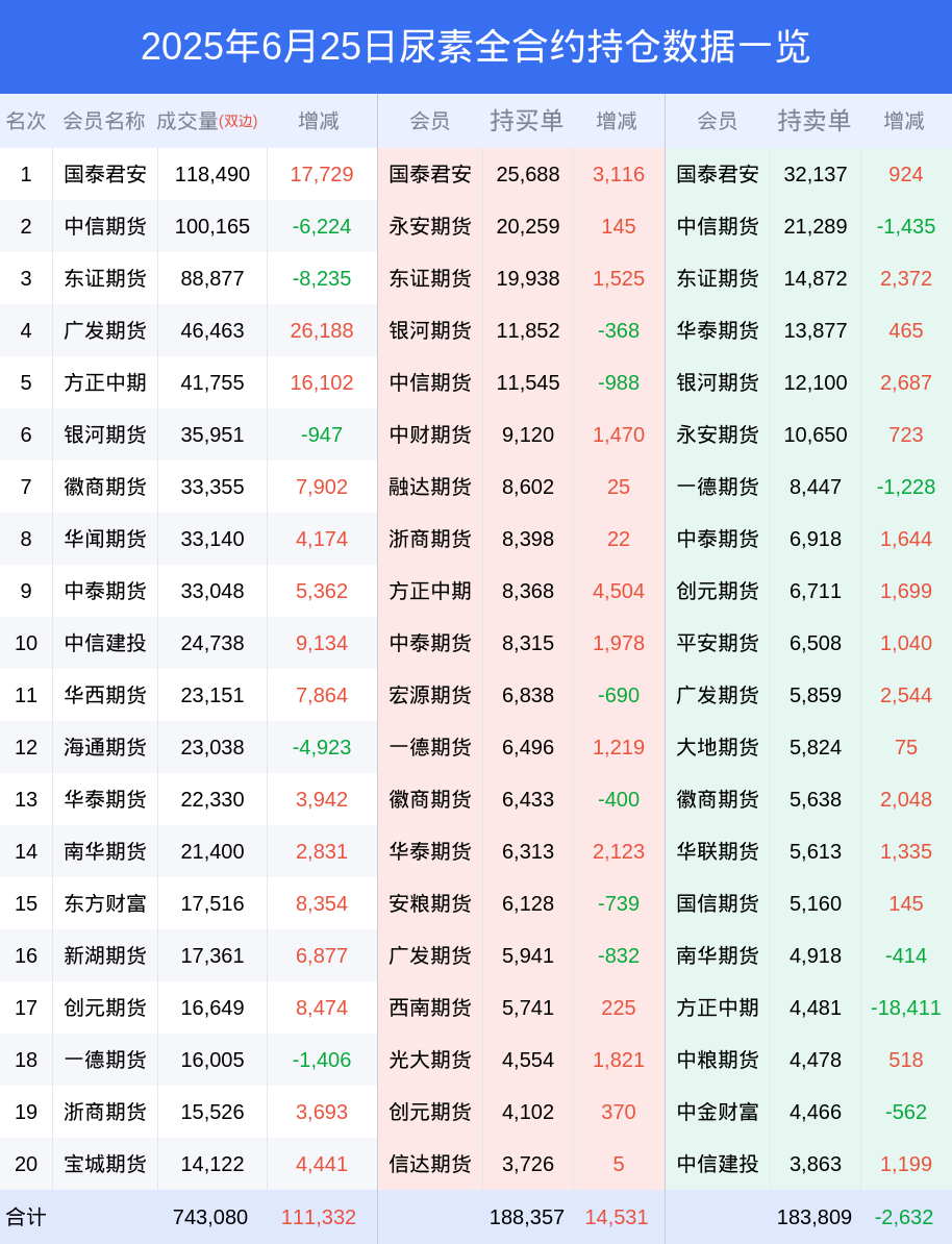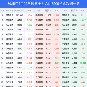新浪期货 根据交易所数据,截至6月25日收盘主力合约尿素2509,涨跌+2.47%,成交量55.14万手,持仓数据显示前20席位呈现净多,差额头寸为9306手。