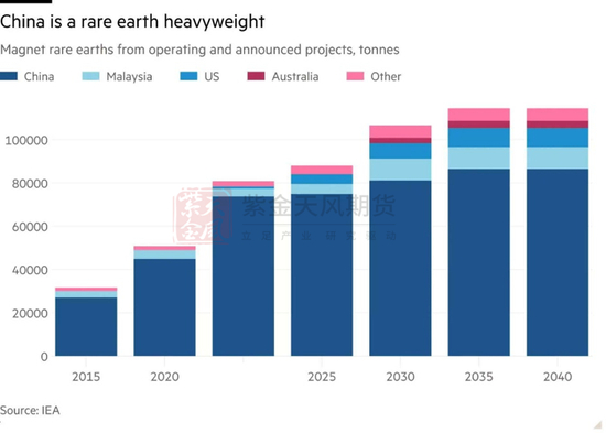 在国际能源署提及的20种矿物中,中国是19种矿物的主要精炼和加工国,平均市场份额约为70%,且未来中国的主导地位很可能会增加。比如,近期中国加强管控的稀土资源,中国掌控着37%储量及90%提炼技术,成为制衡美国的战略王牌。