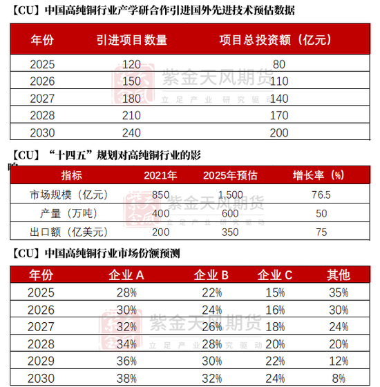 据中国工程院发布的数据,2023年中国高纯铜产量预计达到 150 万吨,同比增长 5%。预计未来 5 年,随着电子信息产业的发展以及新能源汽车、光伏等新兴产业对高纯铜的需求不断增长,中国高纯铜行业市场规模将持续扩大,复合年均增长率将维持在 3%-5% 之间,远高于其他传统用铜行业。