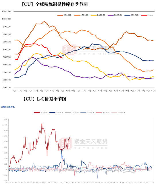 L-C价差:随着今年232法案的出现,今年以来L-C的价差波动远高于去年CMX被动挤仓之时。由于232方案以及美国年内对铝和钢铁屡次调升税率的操作来看,市场对于铜品目关税预期提升至25%以上。而232调查周期较长,在最终官宣前CMX与LME的高价差将会成为常态,且L-C价差原本的波动重心较大可能从600-800美元/吨的区间上移至1000-1200美元/吨。按照25%来算,L-C价差极值至少在2500美元/吨。不过,考虑市场对美国是否可真实消耗大量转运现货,预计期间波动较为反复。