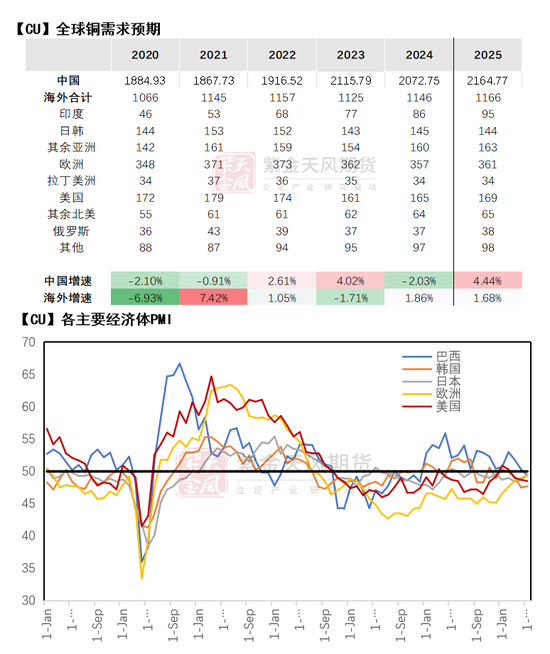 从与铜消费最为紧密的生产端数据来看,全球各主要经济体PMI均处于荣枯线以下,其中日、韩两国受全球的关税的冲击最为明显,巴西等发展中经济体也受到大型跨国公司投资减弱的影响,其PMI下行较为明显;