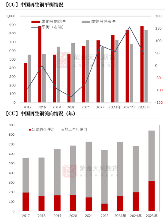经数据调整,从我国铜材加工产能产量和市场结构倒推来看,拆分黄铜企业及紫铜使用量,预计2025年国内再生铜材中实际再生使用量525.61万吨;预计2025年我国冶炼厂的原料占比中,国产再生阳极铜元素约245.2万吨,进口阳极铜103万吨,冶炼用再生共计348.24吨。预计2025年全年再生实际消费量841.33万吨。