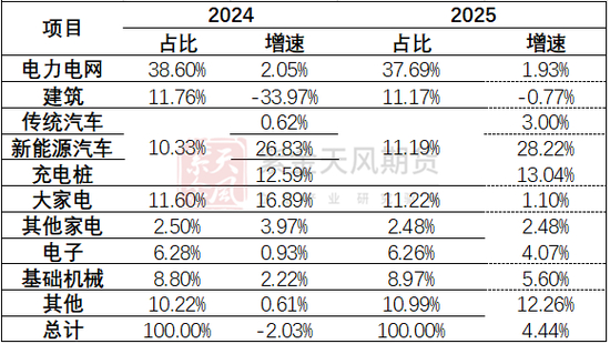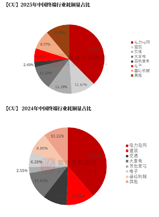 在构建的消费预期上,考虑到2024年的低基数表现,2025年同比存在明显的增长趋势。从精炼耗铜量来看,预计2025年耗铜量1621.8万吨,增速5.74%;从铜元素来看,2025年中国铜终端需求量2164.77万吨,同比增速4.44%,较24年增加92万吨。其中,精炼耗铜量考虑其他非主流铜材精炼铜使用量(如雕塑、合金、不锈钢等)并剔除其他型材原料消耗铜杆量。