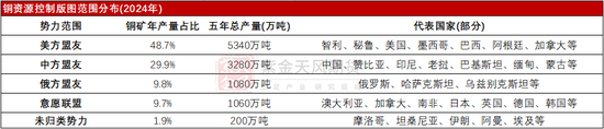 随着地缘政治冲突的升级,全球分裂相互竞争的板块化开始表现得更为明显。从地缘政治表现来看,可以将全球板块划分为五个“控制势力范围”:美方势力、中国势力、俄罗斯势力、“意愿联盟”(Coalition of the Willing)以及“未归类势力”(Undrafted)。这些分组反映了地理、社会、文化和经济联系,同时也揭示了在日益极化的世界中可能形成的政治阵营。哪个板块集团主导以及正在增强对关键矿物如铜粗精炼加工的能力表现的越来越重要。