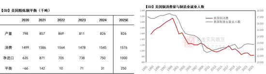 需求端,从历史数据上看,铜作为制造业生产中重要的原材料,美国制造业就业人数是观测美国铜消费量的重要指标(资本品和人力的投入)有着较好的拟合效果。而在2025年,随着美国制造业就业人数持续疲软(短期内出现技术进步的可能性极低),我们认为本年度美国铜消费的量级很难出现大幅的增长;