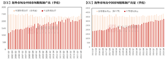 从2010年以来的季度数据来看,无论是海外市场还是中国市场,粗精炼产出始终保持高增速,尤其中国市场稳步增加变现较为明显。即使在近年矿端吃紧、TC价格走低趋于亏损的情况下,海外及国内精炼铜产出依然处于较高点位,并屡屡刷新历史高位。