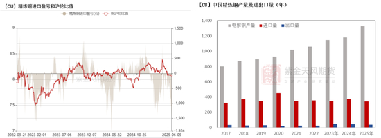 考虑部分海外铜运输路径的变动,预计向中国及亚洲地区流向下降,我们继续调降2025年中国进口铜预期,预计年度进口量级341.56万吨,较2024年下降34.06万吨。同时,考虑出口盈利空间变动,调升2025年年度出口量在40万吨。