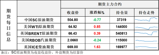 【1】WTI主力原油期货收涨0.55美元,涨幅0.85%,报64.92美元/桶;布伦特主力原油期货收涨0.26美元,涨幅0.39%,报66.43美元/桶;INE原油期货收跌0.77%,报504.8元。