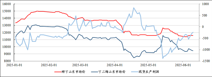 第五阶段(5月下旬至今):丁二烯在三天拉涨近2000点后出现回落,近期呈现持续阴跌之势,主因为其供应仍未完全收紧,而需求羸弱形成拖拽,下游多持观望心态仅刚需采买。顺丁自身基本面偏弱格局依旧,丁二烯弱势运行给出生产利润,供应再度上量,现货端感知偏松。中美关税博弈虽有所缓和,但针对轮胎的232关税细则仍然存在,终端需求羸弱。