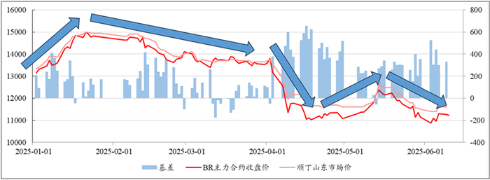 上半年BR盘面于11000元/吨至15000元/吨的近4000点的区间内宽幅震荡。行情大致分为以下五个阶段:
