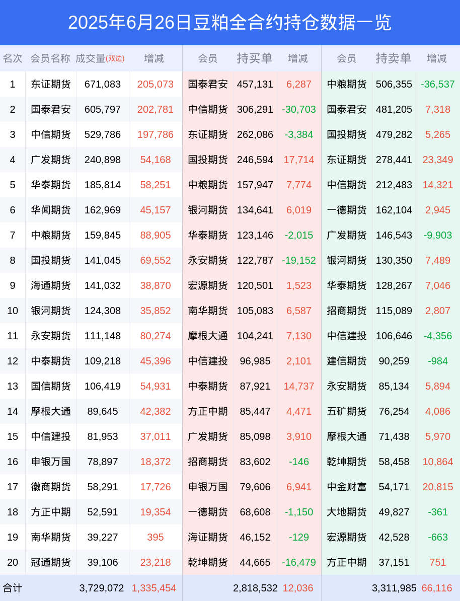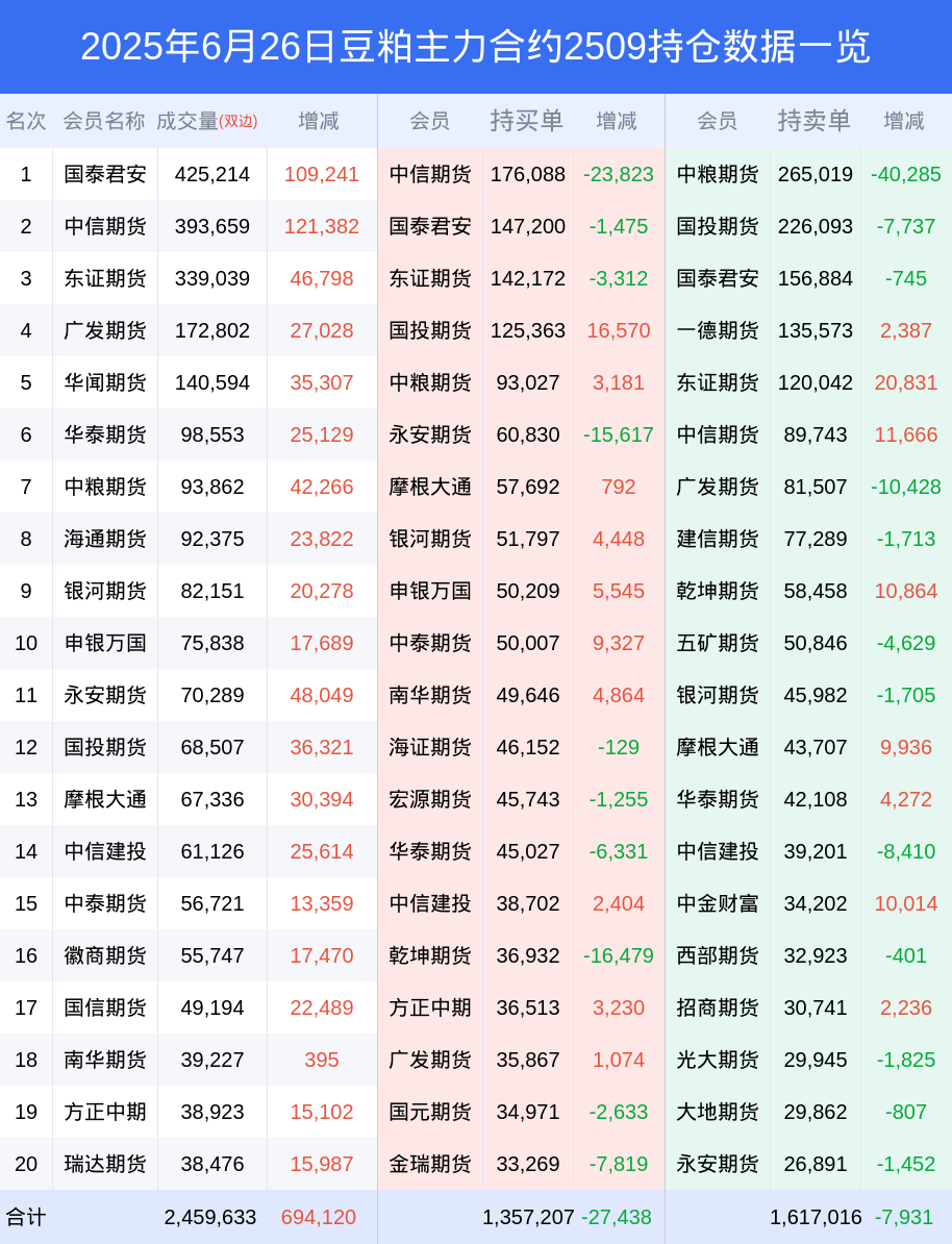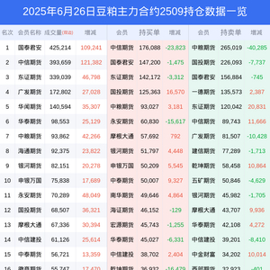 新浪期货 根据交易所数据,截至6月26日收盘主力合约豆粕2509,涨跌-2.43%,成交量185.14万手,持仓数据显示前20席位呈现净空,差额头寸为259809手。