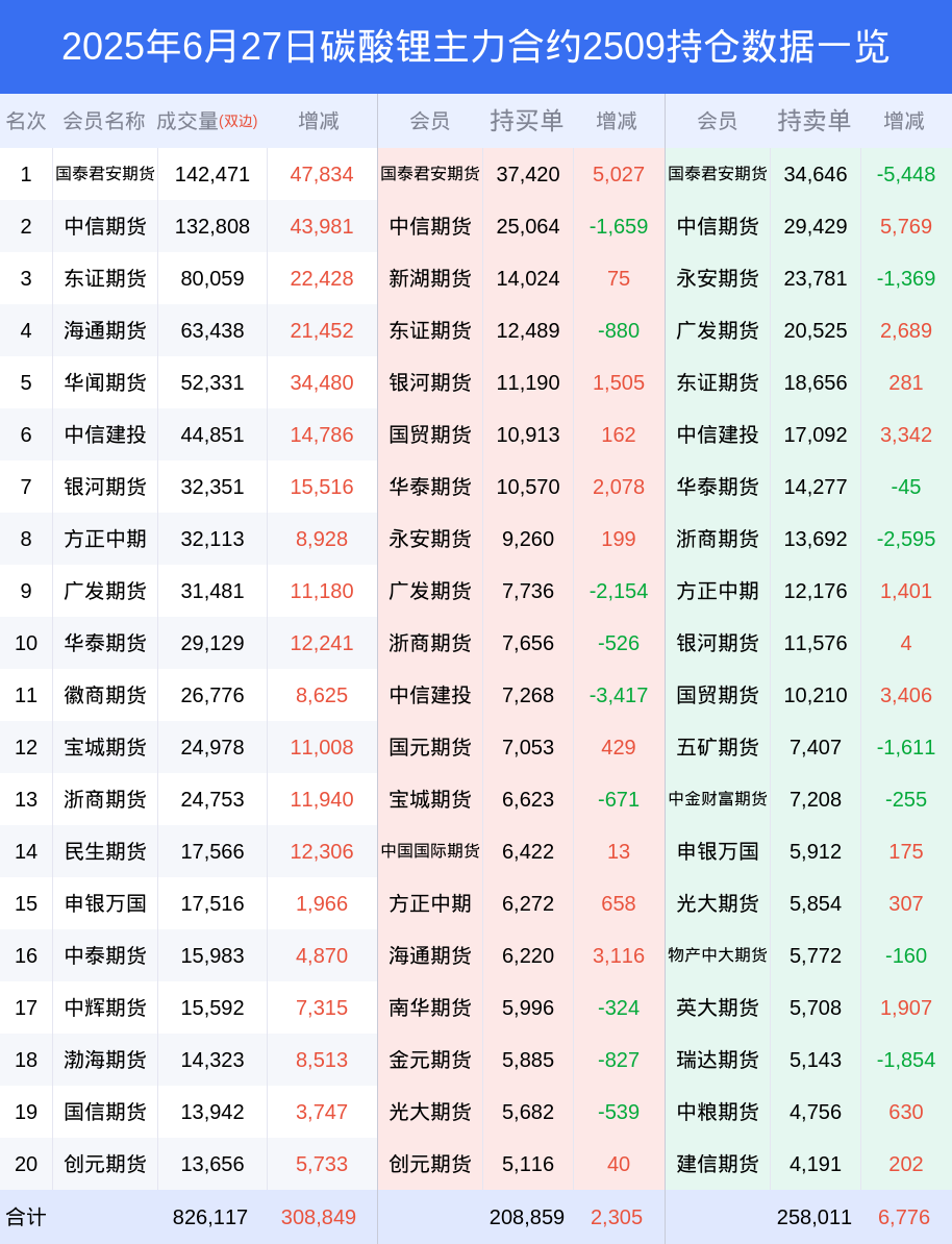 新浪期货 根据交易所数据,截至6月27日收盘主力合约碳酸锂2509,涨跌+3.33%,成交量61.50万手,持仓数据显示前20席位呈现净空,差额头寸为49152手。