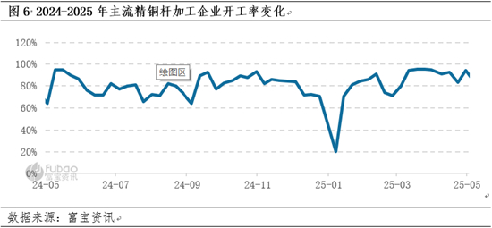 其他铜材产品来看,黄铜棒因关税影响和房地产市场疲软,开工整体不及往年,但因其主要消耗废黄铜,因此对铜需求面影响有限。而紫铜管同样作为市场出货量较大的商品,因2024年底以旧换新政策的延续性影响,2025年上半年产销实现同比增长,其生产企业的开工情况也基本贴合需求淡旺季转化的趋势,但具体情况因宏观影响程度和基本面不同而有所分化。