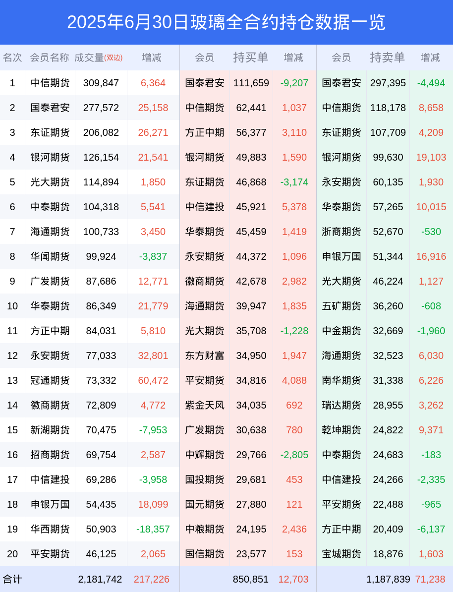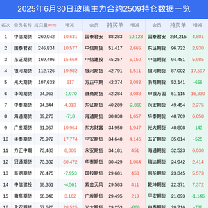 新浪期货 根据交易所数据,截至6月30日收盘主力合约玻璃2509,涨跌-1.28%,成交量161.21万手,持仓数据显示前20席位呈现净空,差额头寸为265604手。