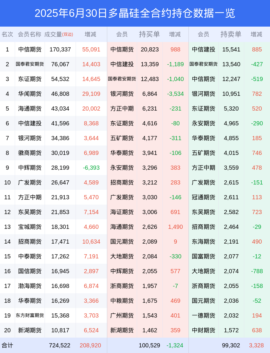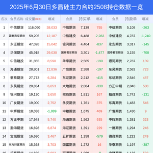 新浪期货 根据交易所数据,截至6月30日收盘主力合约多晶硅2508,涨跌+4.55%,成交量42.12万手,持仓数据显示前20席位呈现净多,差额头寸为4421手。