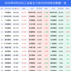 新浪期货 根据交易所数据,截至6月30日收盘主力合约工业硅2509,涨跌+2.94%,成交量137.73万手,持仓数据显示前20席位呈现净空,差额头寸为39106手。