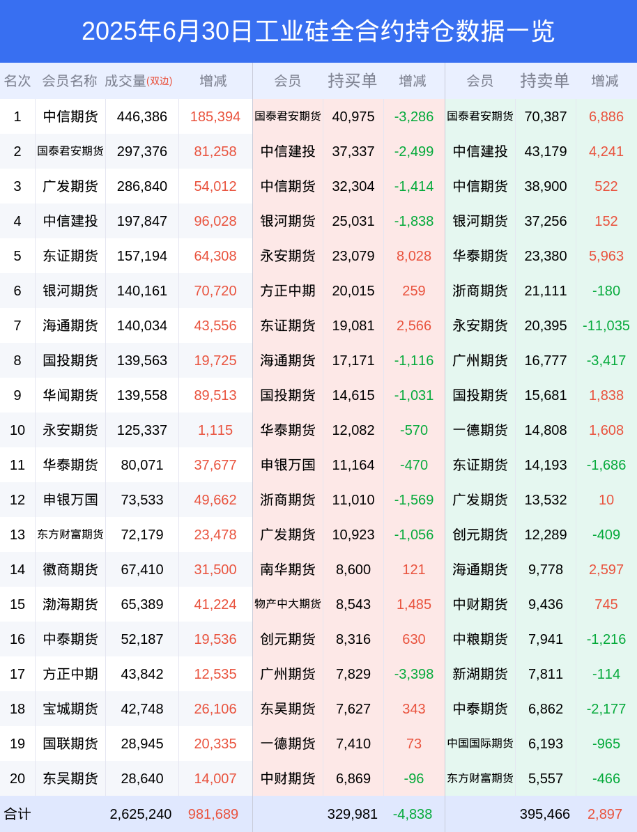 工业硅期货全合约总计成交180.25万手,比上一日新增71.70万手。全合约前20席位多头持仓36.88万手,比上一日减少5364手。全合约前20席位空头持仓42.32万手,比上一日增加6190手。