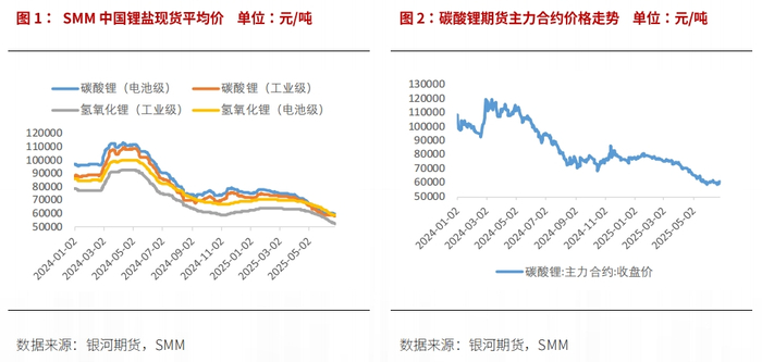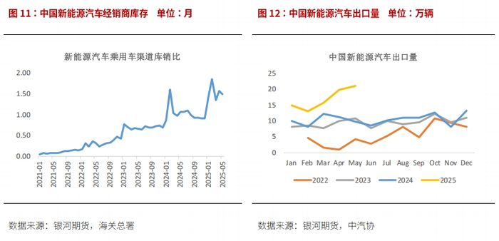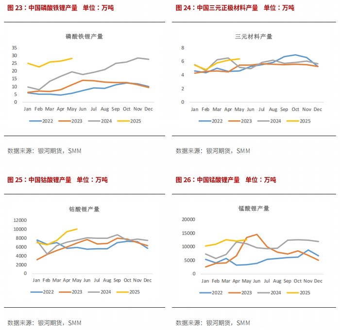 2025年1-5月磷酸铁锂产量128.5万吨,累计同比增长89%;三元材料产量累计同比增长2%至28.7万吨,三元电池装机量占比进一步下滑至20%以下。若季节性正常,9-10月仍能见到消费旺季,但这取决于7-8月能否出现淡季。根据SMM统计,6月末下游原料库存不足半个月用量。若需求超预期,后市可能见到阶段性补库带来的价格反弹。