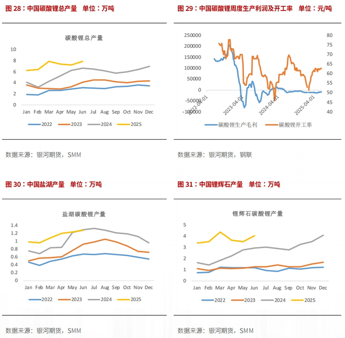 上半年市场整体呈下跌趋势,指数跌幅自最高点至最低点约28%。2月春节之后江西头部大厂复产,迅速提升至满产,供应短缺局面改善。4月初关税问题困扰“新三样”出口,需求担忧拖累价格下跌直到6月。6月宏观氛围转向,价格低位盘整,6月末借整体市场强势,叠加多重利多消息冲击,碳酸锂价格呈现强势拉升。