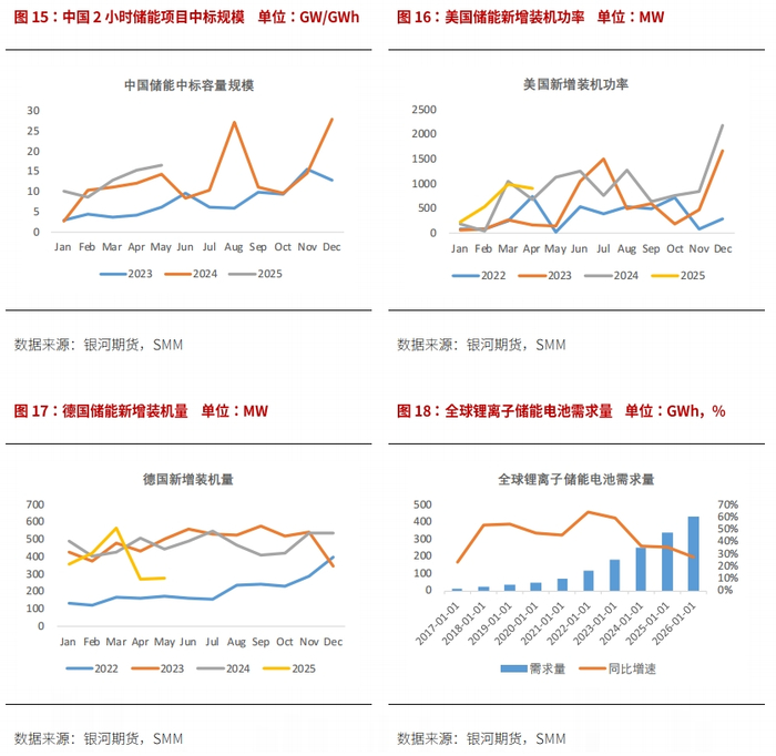 根据SMM数据,美国储能新增装机1-4月累计同比增长37%,去年同期增长229%,德国储能新增装机1-5月累计同比下降17%,去年同期增长2%,增速均显著放缓。中国储能出口增量来源包括中东、南美、澳大利亚等地的中标项目,也是储能需求的另一大支柱,且更具持续性。本轮“抢出口”结束后关注出口需求是否被透支。