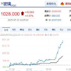 快讯:2025年7月2日,玻璃主力合约日内大涨4.00%,现报1028.00元/吨。纯碱主力合约日内涨超2.00%,现报1193.00元/吨。