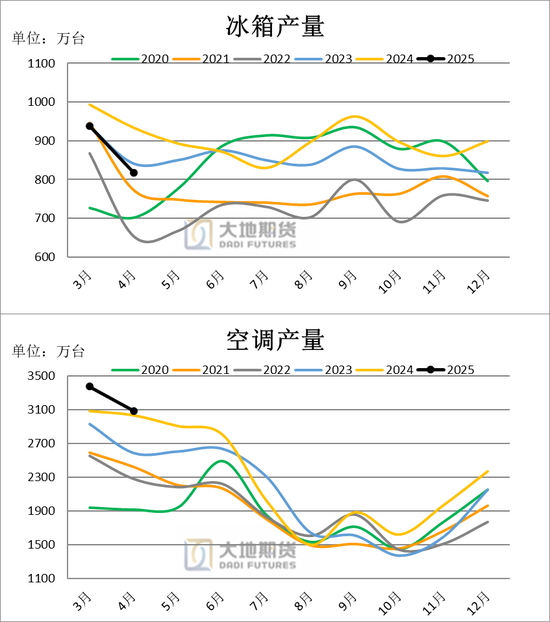 国家统计局数据显示,2025年空调1-4月累计产量10531.4万台,同比增长7.2%。冰箱累计产量3220.4万台,同比下降0.7%。洗衣机累计产量3918.8万台,同比增长10.9%彩电累计产量5966.6万台,同比下降3.9%。