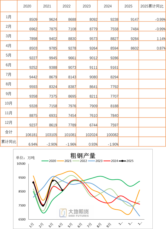 钢厂利润有所好转,整体产量略有提升。4月粗钢产量8602万吨,同比增加0.09%。1-4月累计提高0.87%。