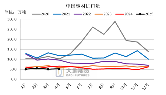 2025年4月,我国进口钢材52.2万吨,环比增加2.1万吨,增长4.2%。1-4月累计进口钢材207.2万吨,同比减少33.3万吨,下降13.8%。4月出口钢材1046.2万吨,环比增加0.6万吨,增长0.06%;同比增加57.44万吨,增长5.8%。1-4月累计出口钢材3789.1万吨,同比增加286.5万吨,增长8.2%。